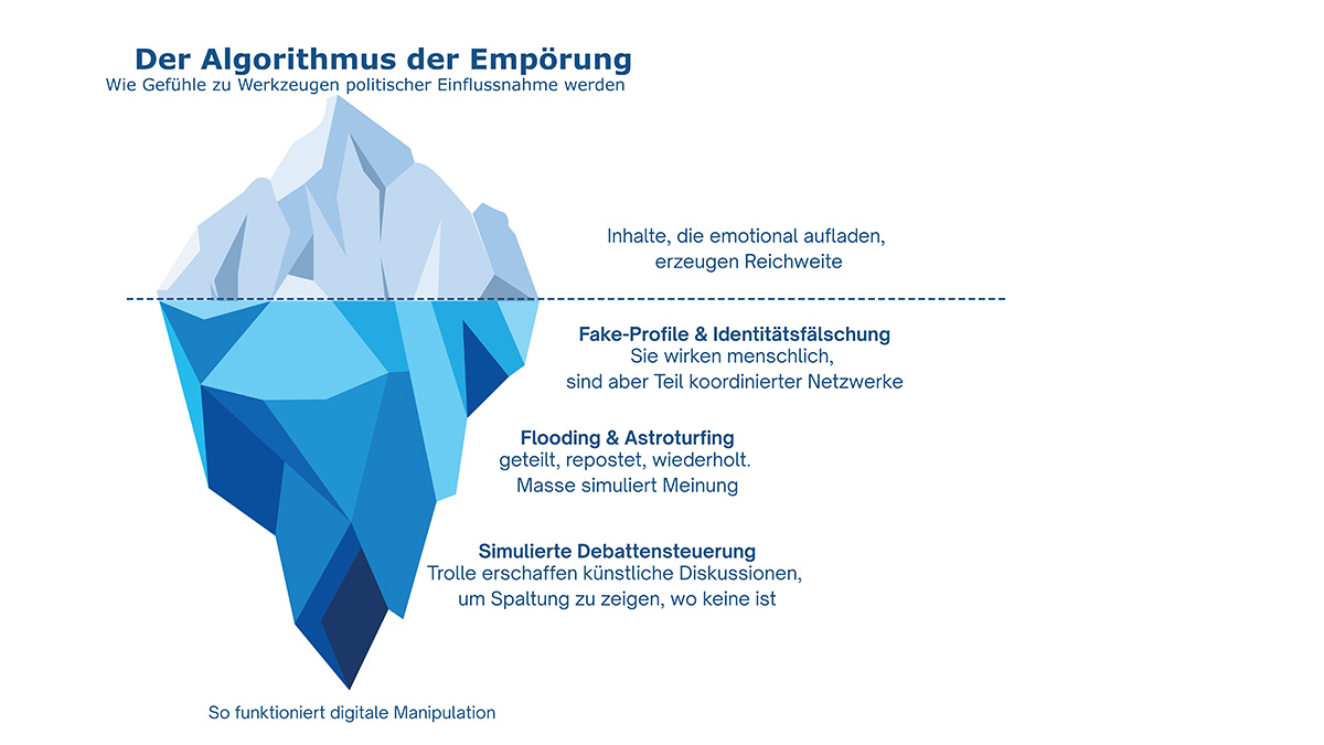 „Wer einmal einem bestimmten Narrativ folgt, bekommt zunehmend ähnliche Inhalte angezeigt. Ein Kreislauf, der zu Filterblasen und Echokammern führt. Alternative Perspektiven verschwinden, Polarisierung wächst.“