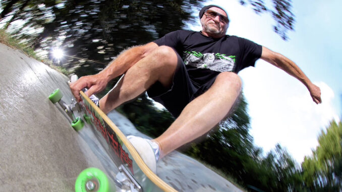 „Wäre es im Moment nicht so vereist, wäre ich wahrscheinlich heute Morgen mit dem Board zum Brötchenholen gerollt. Als alter Mann von 77 Jahren wollte ich das Risiko dann aber doch nicht eingehen, vom Eis oder von irgendwelchem verdammten Split abrupt gestoppt zu werden und wie ein gefällter Baum den Asphalt zu küssen. Mein letzter Ausflug auf dem Brett ist inzwischen zwei oder drei Wochen her. Im Sommer rolle ich dafür jedes Wochenende zum Bäcker – und mein Lieblingstrick ist dabei, die Brötchen nicht zu verlieren.“