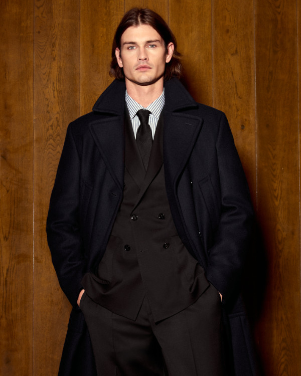 Der zweite Look ist klassisch mit Anzug und Krawatte. Ein moderner Klassiker, neu interpretiert: Doppelreiher aus 98 Prozent Wolle und 2 Prozent Elastan. Elegant und schmal geschnitten und zeigt ein neues softes Tailoring vor allem im Schulterbereich, der ultrasoft und leicht konstruiert ist. Hose mit Bundfalte und moderater Weite. Modische Kombination mit Streifenhemd und einer tonal gehaltenen Krawatte. The Comeback of new Classic! Weitergehend kombiniert mit einem Zweireiher-Mantel mit sportiven Taschendetails und einer leichten Taillierung. Dazu Derby-Schnürschuhe.