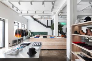 Die gesamte Warenwelt wird sehr zeitgemäß in einem funktional-puristischen Ambiente aus Beton, Stahl, großen weißen Wänden und perfektem Lichtdesign in Szene gesetzt. Die Räumlichkeiten sind schlicht gehalten und strahlen viel Ruhe aus. Alles wirkt wie in einem großen Showroom mit internationalem Flair und unverwechselbarer Ausstrahlung. Das schöne, aber dennoch zurückhaltende Mobiliar, bestehend größtenteils aus Regalen, Kleiderstangen und Podesten, sorgt zudem für ein hohes Maß an Flexibilität, sodass die Verkaufsfläche leicht umgestaltet werden kann, um neue Akzente zu setzen. Fazit: viel Platz für ein einzigartiges Sortiment, das jede Saison mit großer Sorgfalt und dem nötigen Feingespür kuratiert wird. Ein Must-visit!